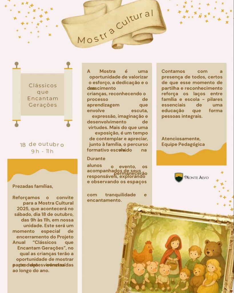 A Escola Monte Alvo, única instituição de Educação Personalizada com identidade cristã católica do Estado, promove a Mostra Cultural 2025, que marca o encerramento do Projeto Anual “Clássicos que Encantam Gerações”. Serão duas datas: no dia 18 de outubro, das 9h às 11h, na unidade de Vila Velha, e no dia 25 de outubro, no mesmo horário, na unidade de Vitória.