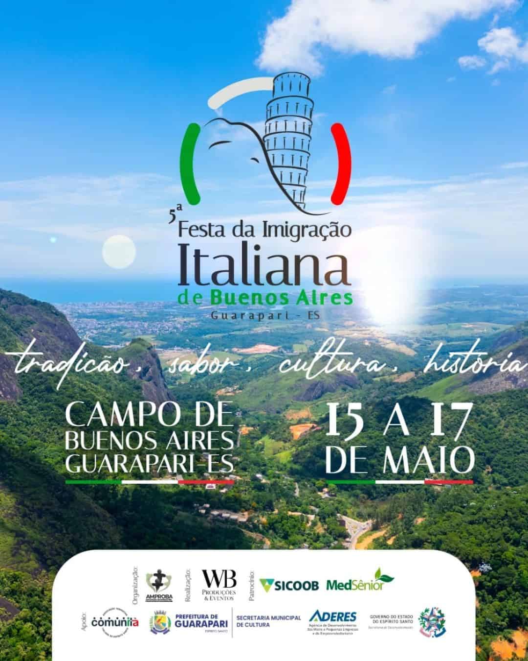 Entre os dias 15 e 17 de maio, a pitoresca comunidade de Buenos Aires, localizada na área rural de Guarapari, sediará a 5ª Festa da Imigração Italiana. Realizada no Campo de Buenos Aires, a festividade é um convite para exaltar a tradição, o sabor, a cultura e a história dos colonizadores italianos na região das montanhas do município, oferecendo um mergulho nas raízes capixabas.