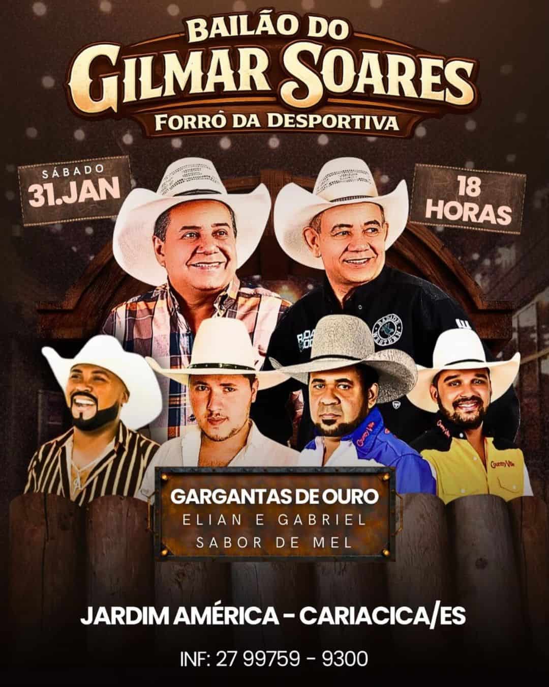 No sábado, dia 31 de janeiro, o bairro Jardim América, em Cariacica, será palco do “Bailão do Gilmar Soares”, realizado no espaço Forró da Desportiva a partir das 18h. O evento promete uma noite animada para os amantes da dança, contando com apresentações musicais de Gargantas de Ouro, Elian e Gabriel, e Sabor de Mel, além do anfitrião Gilmar Soares, consolidando-se como uma excelente opção de lazer e música ao vivo na região.