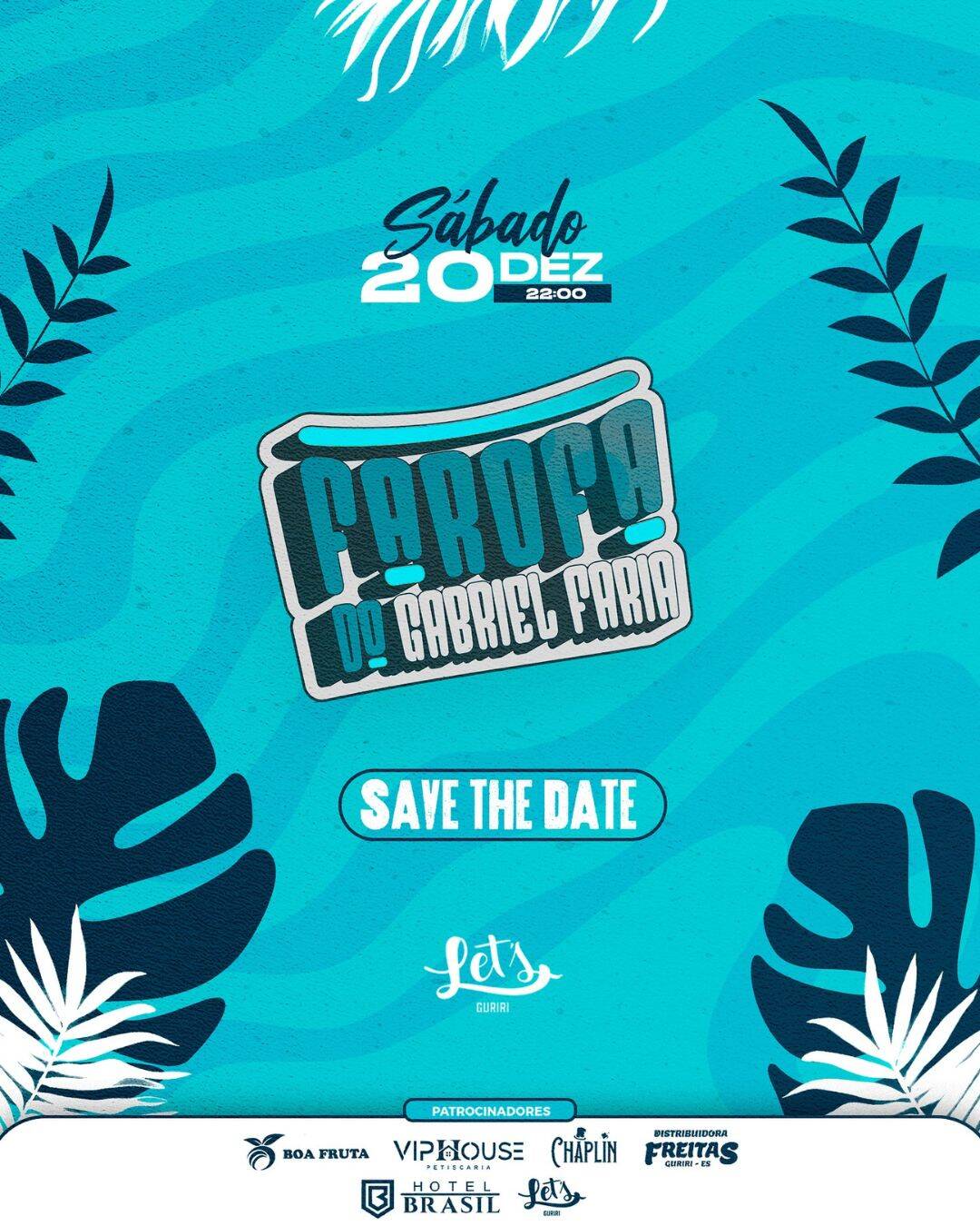 A temporada de verão em Guriri ganha um agito especial com a “Farofa do Gabriel Faria”. Marcado para o sábado, dia 20 de dezembro, às 22h, o evento acontece no Let’s Guriri e promete ser uma das grandes festas de pré-réveillon da região. Com a liberação do lote promocional, a festa conta com abadás exclusivos, em um clima de micareta e muita animação para celebrar o final do ano no litoral capixaba.