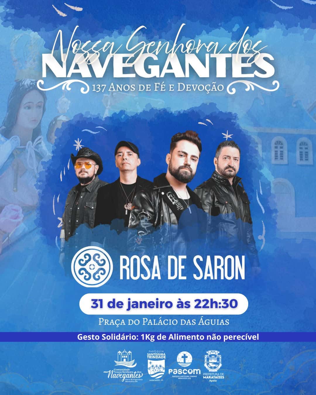 O ponto alto da programação acontece às 22h30, com o aguardado show do Rosa de Saron, um dos maiores expoentes do rock cristão nacional. Reconhecida por suas letras poéticas e apresentações intensas, a banda traz para o palco de Nossa Senhora dos Navegantes os grandes sucessos de sua trajetória, prometendo uma experiência inesquecível de adoração para fãs de todas as idades.