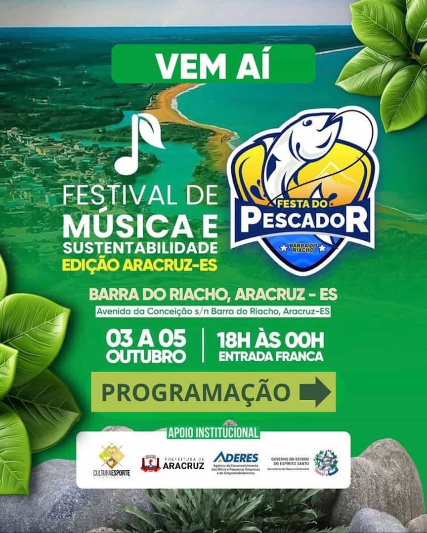 O distrito de Barra do Riacho, em Aracruz, se prepara para receber o Festival de Música e Sustentabilidade, que realiza a tradicional Festa do Pescador entre os dias 03 e 05 de outubro. O evento, com entrada gratuita, promete três dias de muita música, cultura e celebração para moradores e visitantes na Avenida da Conceição, ao lado da Associação de Pescadores.