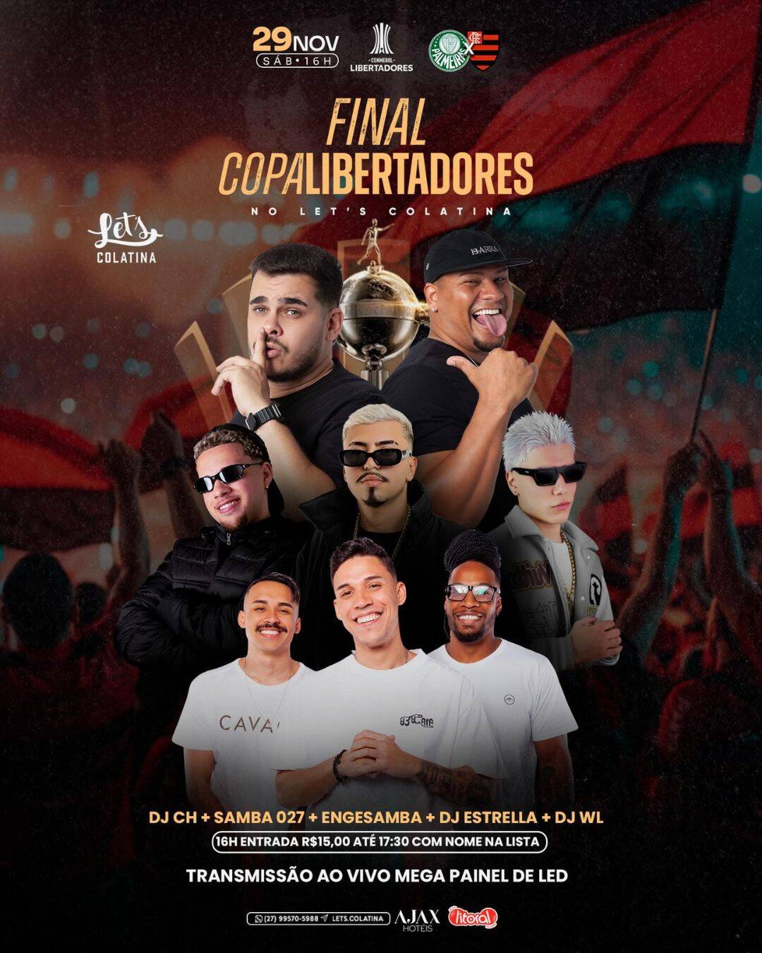 Prepare-se para viver as emoções da grande final da Copa Libertadores da América em um ambiente exclusivo! No sábado, dia 29 de novembro, o Let’s Colatina abre as portas a partir das 16h com um mega painel de LED para transmitir o jogo ao vivo. A festa continua após o apito final com uma mistura contagiante de ritmos: o pagode fica por conta dos grupos Engesamba e Samba 027, enquanto o funk domina a pista com os DJs Estrella, WL e CH. É a oportunidade perfeita para torcer e curtir uma festa completa com entrada promocional R$15,00 até as 17h30, com nome na lista.