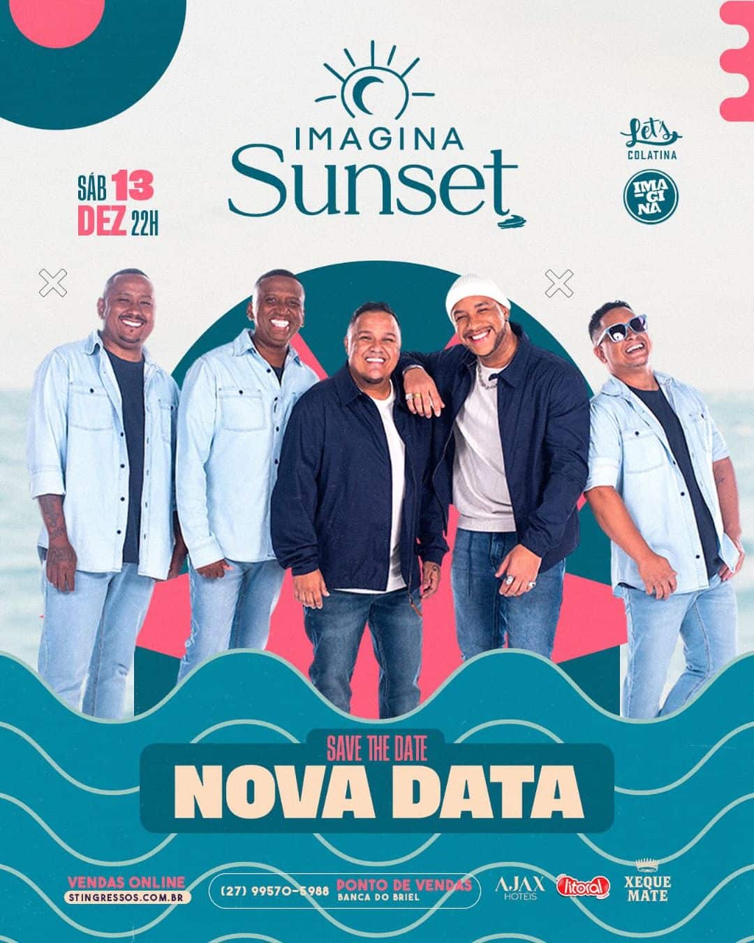 O grupo que conquistou o Brasil com seu pagode romântico aterrissa em Colatina para um show inesquecível. O “Imagina Sunset” foi reagendado para o sábado, 13 de dezembro, com início às 22h, prometendo trazer todos os grandes sucessos do Imaginasamba. O evento acontecerá no Let’s Colatina e os ingressos adquiridos anteriormente permanecem válidos, sendo uma noite imperdível para os fãs cantarem junto em um clima de pôr do sol estendido noite adentro.
