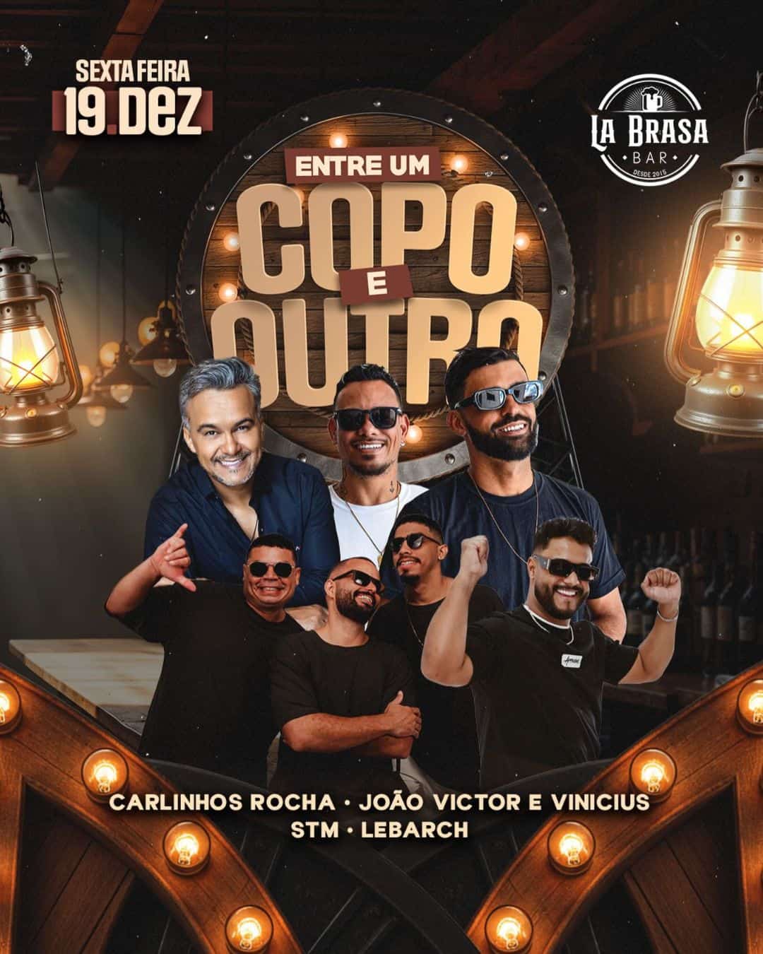 Na sexta-feira, 19 de dezembro, o La Brasa Bar realiza o evento “Entre um Copo e Outro”, reunindo diversas atrações musicais em uma única noite. O público poderá conferir shows de Carlinhos Rocha, da dupla João Victor e Vinicius, além de STM e Lebarch, garantindo uma mistura de ritmos no ambiente rústico do bar.