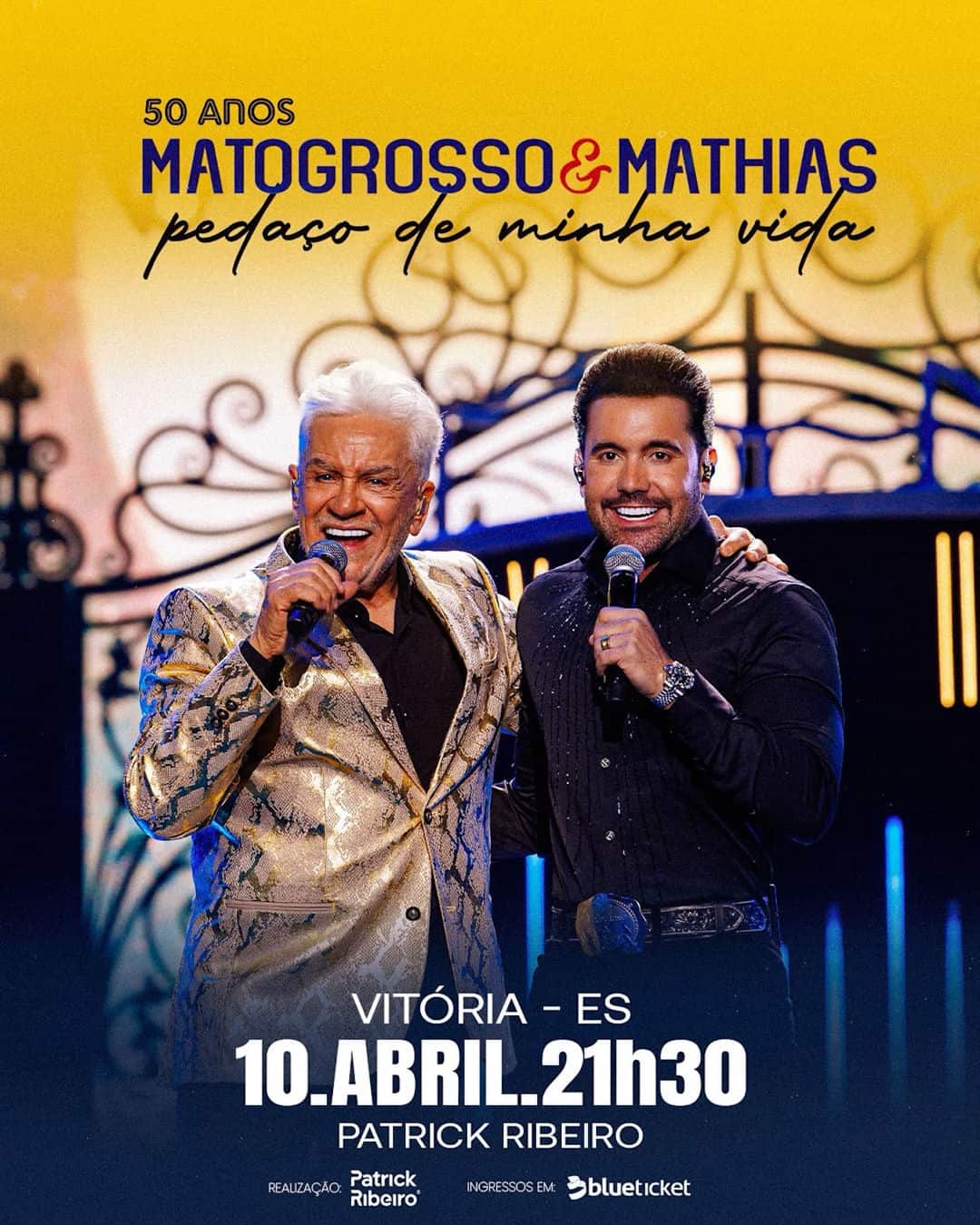 A lendária dupla sertaneja Matogrosso & Mathias celebrará seus 50 anos de carreira com a turnê comemorativa “Pedaço de Vida” no dia 10 de abril de 2026, no Espaço Patrick Ribeiro, em Vitória (ES). Com abertura dos portões às 20h30 e início da apresentação às 21h30, o evento promete uma viagem pela essência do sertanejo romântico, reunindo fãs para celebrar clássicos que marcaram gerações, como “Tentei Te Esquecer” e “24 Horas de Amor”.