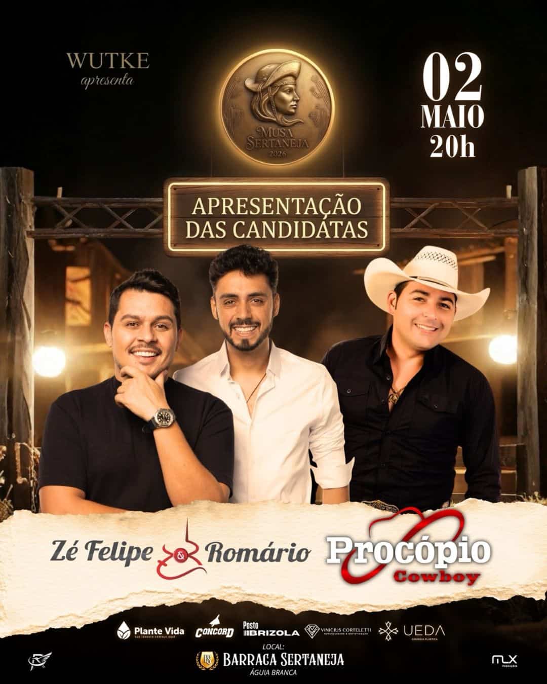 Para embalar a noite de gala, o palco receberá dois grandes shows que prometem não deixar ninguém parado. A dupla Zé Felipe & Romário traz o melhor do sertanejo atual, enquanto Procópio Cowboy garante a energia do modão e do piseiro. O espetáculo combina o brilho do concurso com a força da música ao vivo, criando uma atmosfera de muita emoção e entretenimento. Os ingressos são limitados e a organização recomenda que o público garanta sua entrada antecipadamente para prestigiar este marco do calendário social de 2026.