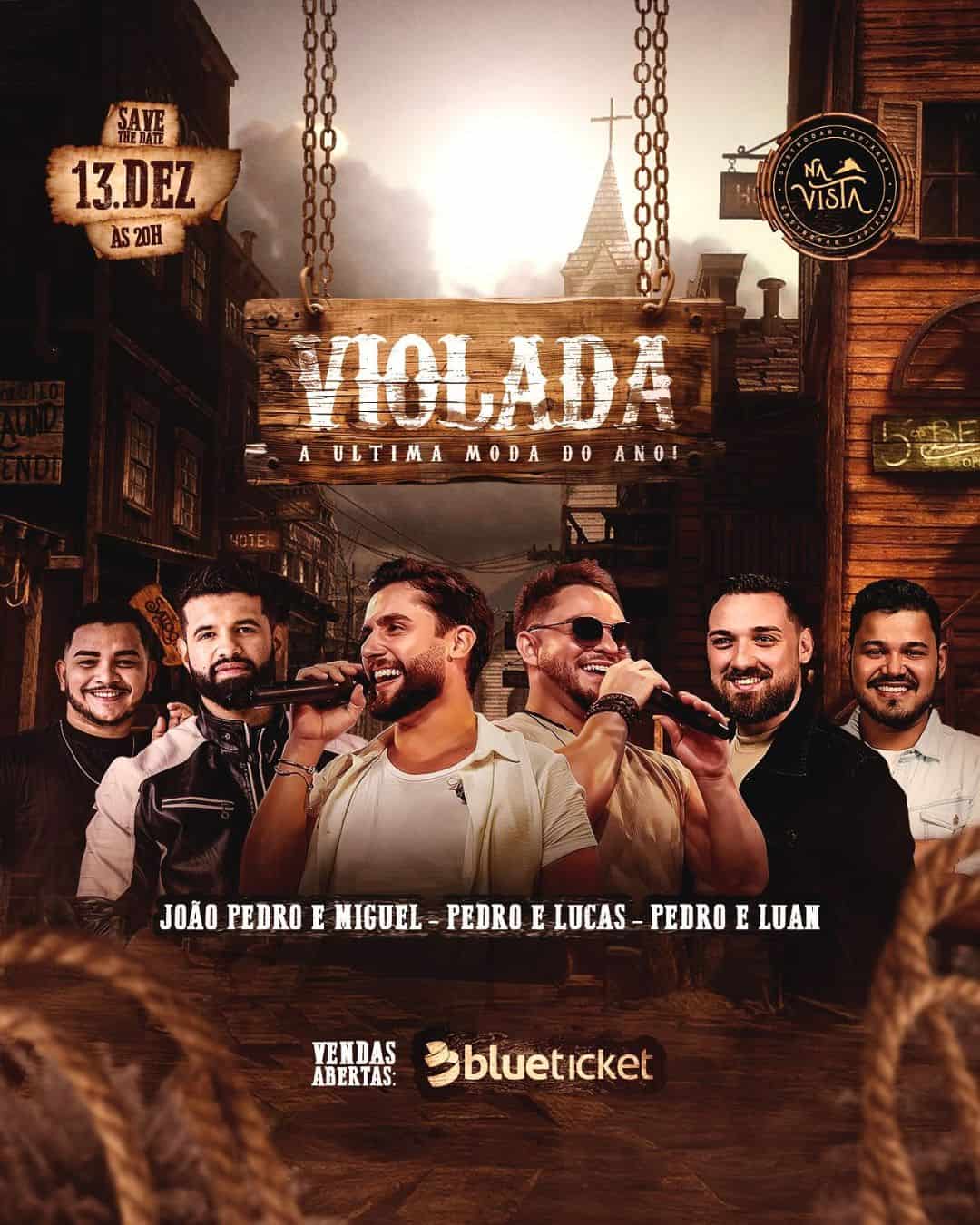 Para fechar o calendário de 2025 com chave de ouro, a “Violada” apresenta sua edição especial “A Última Moda do Ano” no dia 13 de dezembro, trazendo o melhor do universo sertanejo para o Na Vista. Com uma estética rústica inspirada nos saloons e no estilo western, a noite será comandada pelas duplas João Pedro & Miguel, Pedro & Lucas e Pedro & Luan, prometendo muita moda de viola e sofrência de qualidade. O evento é uma celebração da trajetória anual da festa, ideal para os amantes do gênero que querem brindar o final do ano em grande estilo e com a “bota de ouro”.