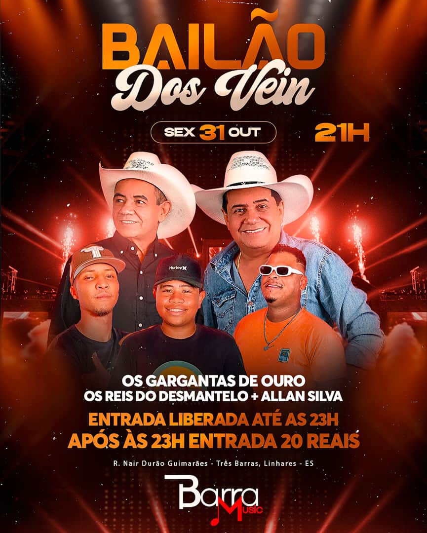 Prepare-se para a melhor sexta-feira do mês! Amanhã (31/10), o Barra Music apresenta o Bailão dos Véin com ninguém menos que Os Gargantas de Ouro! 🤠