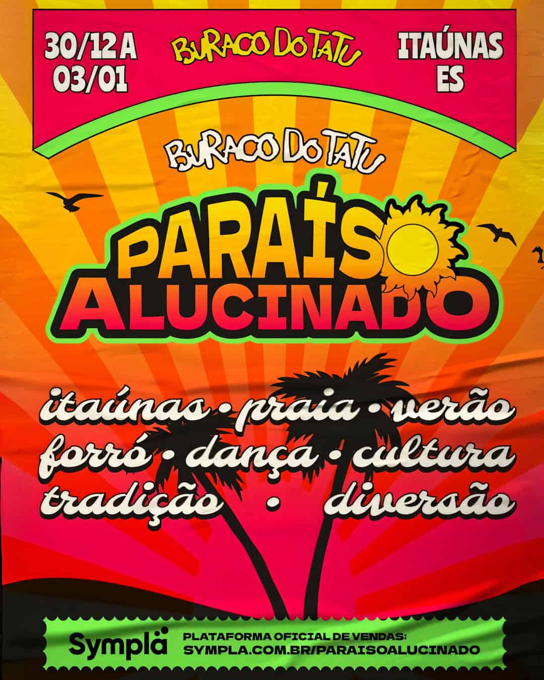 O Paraíso Alucinado – Réveillon 2026 acontece de 30 de dezembro de 2025 a 03 de janeiro de 2026, no Buraco do Tatu, em Itaúnas, Conceição da Barra. Entre as atrações confirmadas estão Mestrinho, Trio Xamego, Diego Oliveira, Alvorada, Diana do Sertão, Potiguá, Coisa de Zé, Nando Nogueira, Forrofiá, Bárbara Greco, Badalação (Duo Coisa de Zé e Alvorada), Amor di Montão (Duo Diego Oliveira e Nando Nogueira), DJs e oficinas de dança.