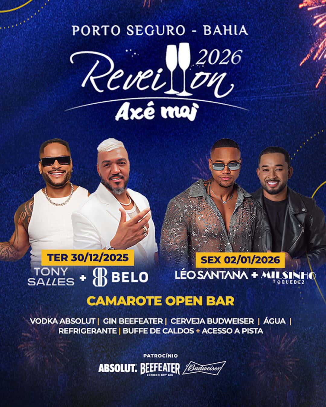 O Réveillon Axé Moi 2026 será realizado na Arena Axé Moi, em Porto Seguro (BA), promovendo uma grande celebração nos dias 30 de dezembro de 2025 e 02 de janeiro de 2026. A festa contará com shows imperdíveis dos cantores Tony Salles e Belo, no dia 30, e Léo Santana e Milsinho Toque Dez, no dia 02. O público poderá optar entre a pista pavimentada ou o Camarote Open Bar, que oferece bebidas premium como Cerveja Budweiser, Vodka Absolut e Gin Beefeater, além de um buffet de caldos variados, garantindo conforto e segurança para a virada de ano.