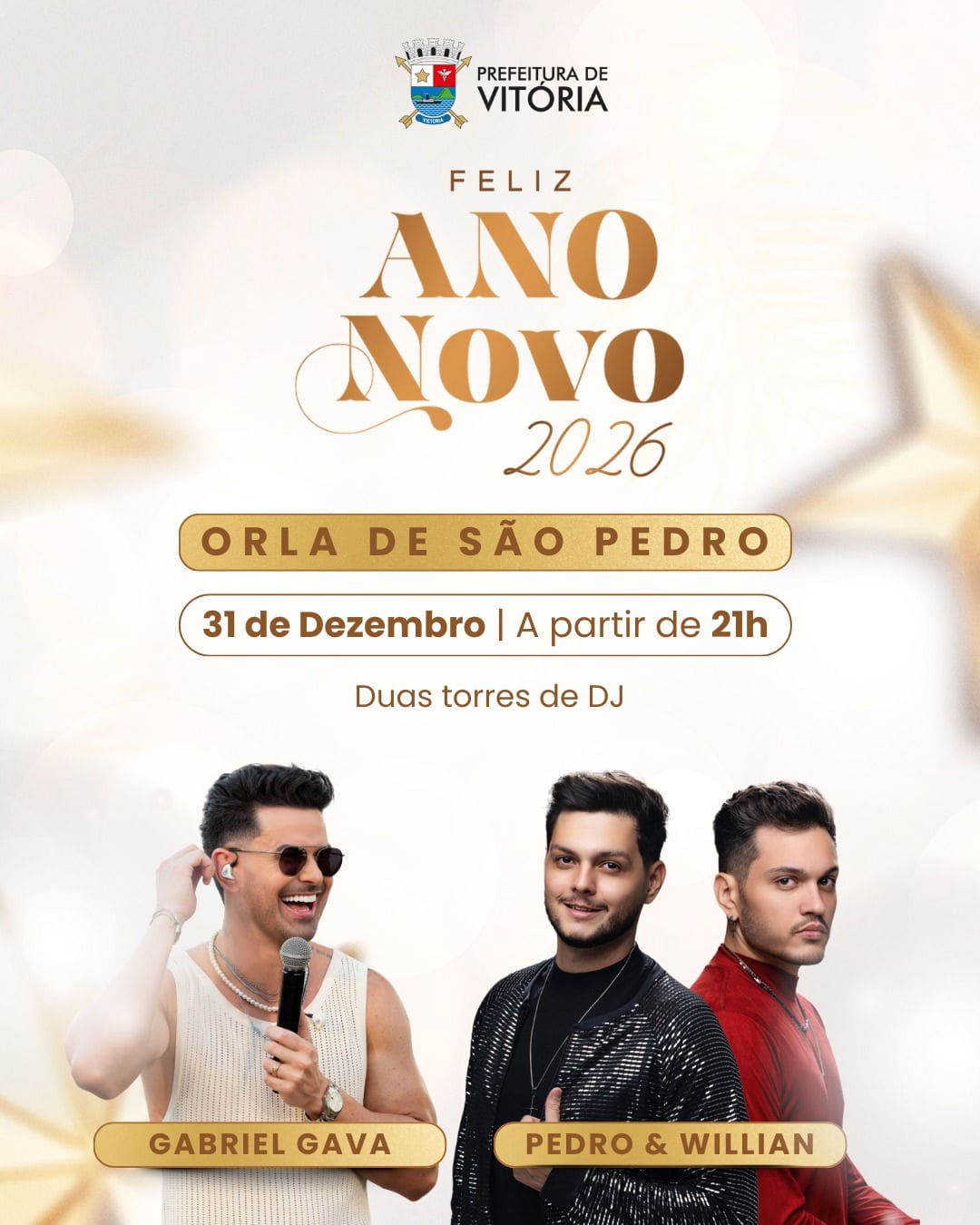 2026 está chegando e a festa já tem endereço! Venha celebrar a virada em um dos cenários mais bonitos da nossa cidade. A música fica por conta de Pedro e Willian, aquecendo o público com muita energia, e o show imperdível de Gabriel Gava, pra todo mundo cantar junto!