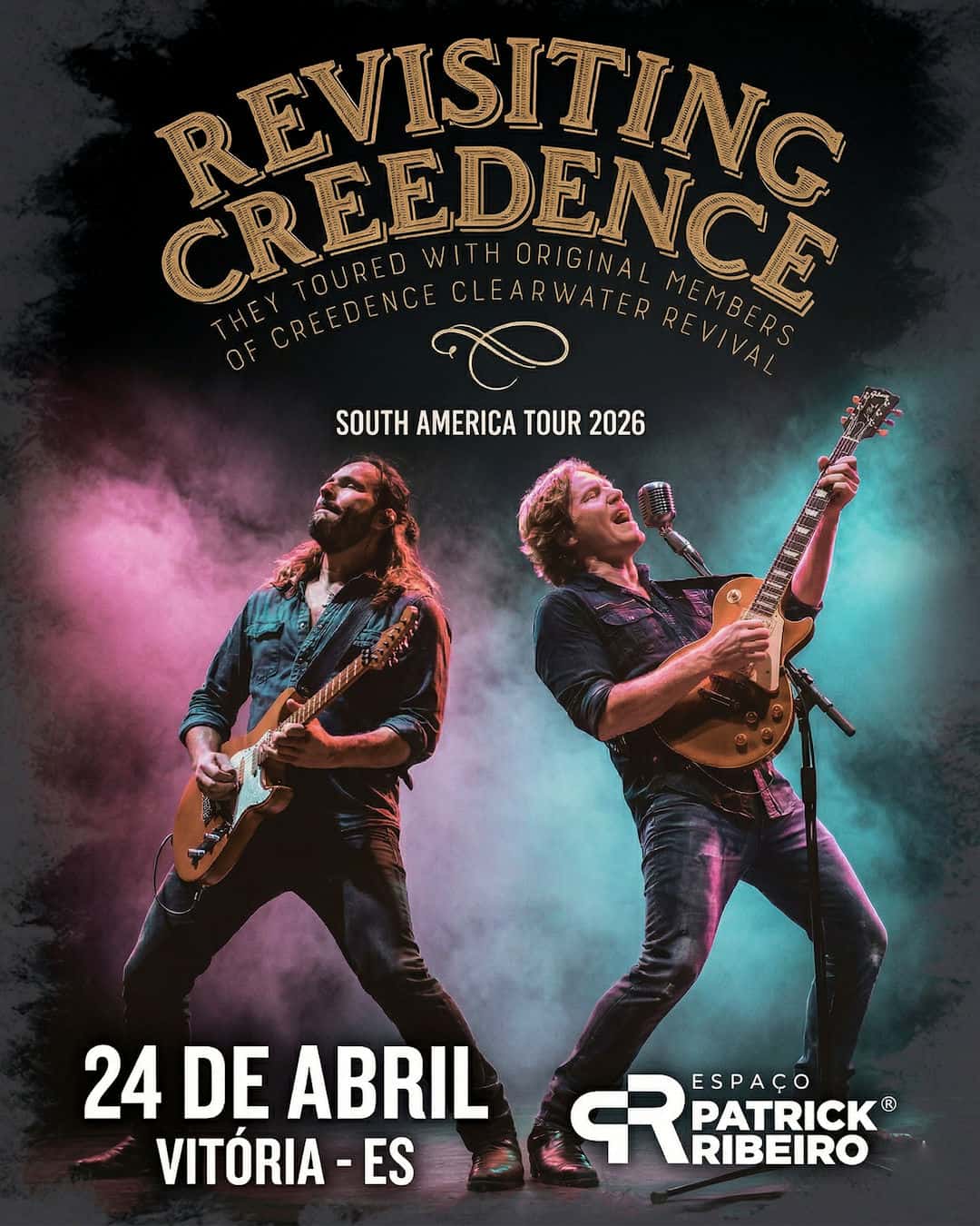 O Revisiting Creedence, projeto liderado pelos músicos Dan McGuinness e Kurt Griffey, se apresenta no Espaço Patrick Ribeiro, em Vitória (ES), no dia 24 de abril. A dupla, que excursionou por anos ao lado de membros originais do Creedence Clearwater Revival, promete celebrar o legado do rock clássico das décadas de 60 e 70 tocando os maiores sucessos do grupo, como “Fortunate Son”, “Susie Q” e “Have You Ever Seen the Rain?”.
