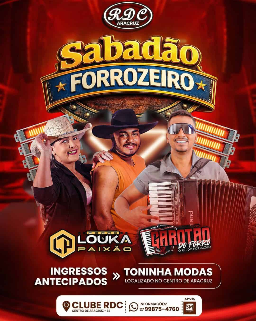 A noite de sábado (31) promete muita animação a partir das 22h30 com o evento “Sabadão Forrozeiro”, que traz ao palco as atrações Louka Paixão e Garotão do Forró, conhecido como o rei do forrózão. Os ingressos antecipados já estão disponíveis na Toninha Modas.