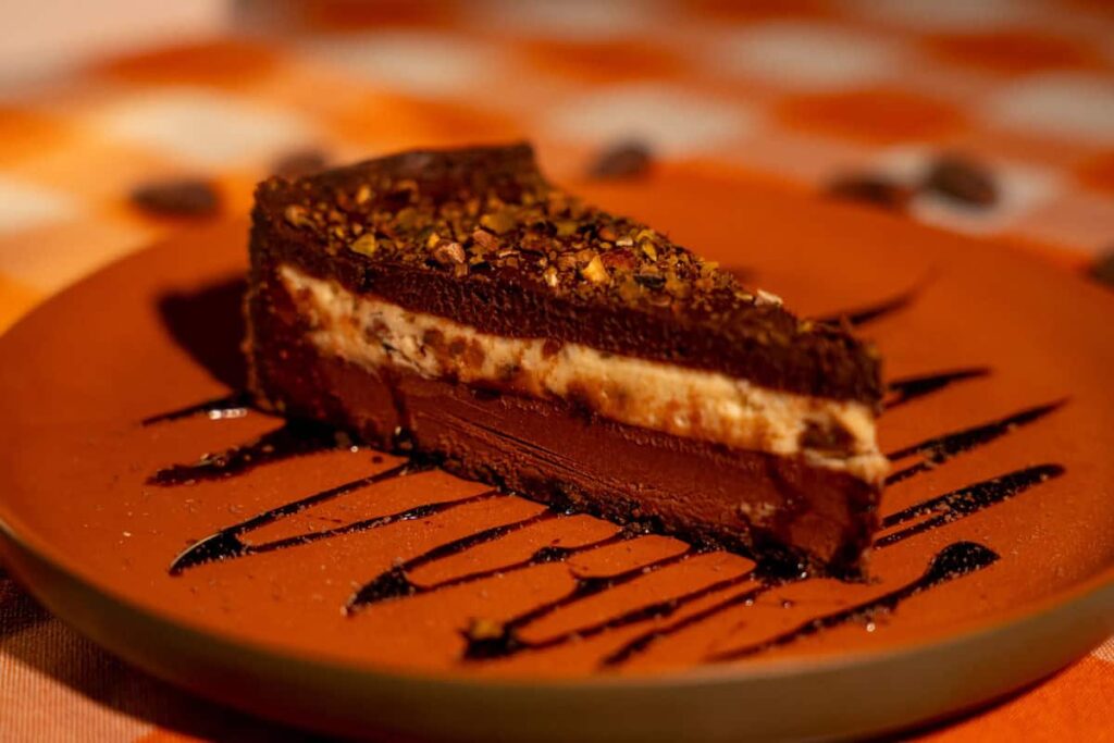 Prato 1: Bolo de chocolate com nozes – O clássico bolo de chocolate, agora ainda mais especial: massa rica em cacau, nozes crocantes e cobertura irresistível de ganache.