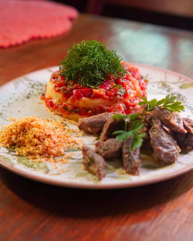 Prato 1: Parmegiana do lenhador – No coração da mata, onde o fogo da lenha aquece e o aroma da terra se mistura ao vento fresco das montanhas, nasceu a inspiração para este prato. A fraldinha assada na brasa representa a força dos lenhadores que moldaram histórias de coragem e simplicidade. Recebe então o abraço de um molho rústico defumado, que carrega em sua fumaça a memória das fogueiras ancestrais. Para suavizar, o musseline de batata traz o aconchego, como a mata que acolhe e protege. Assim surge o Parmegiana do Lenhador: um encontro entre rusticidade e delicadeza, um prato que traduz a essência do Restaurante da Mata — onde cada sabor é raiz, cada detalhe é história, e cada refeição é uma celebração da vida ao redor do fogo.