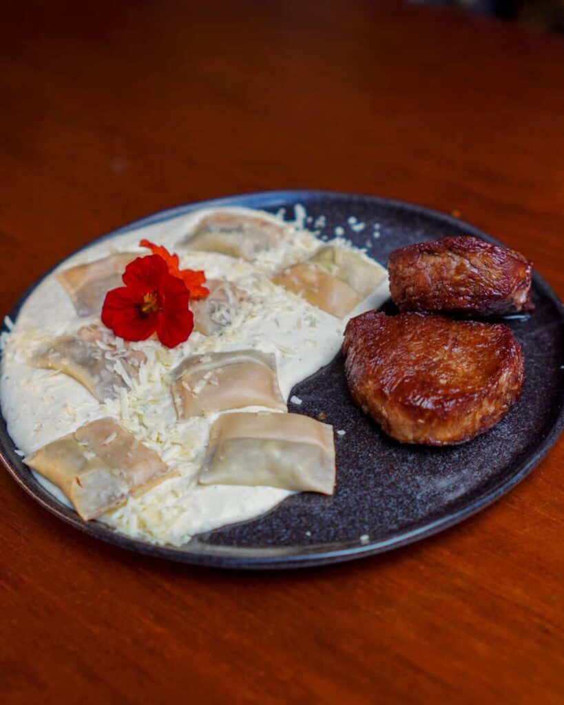 Prato: Ravioli duplo – Ravioli metade ossobuco cremoso, marinado por 12h e metade parmesão, ricota e tomate seco, acompanhado de molho Alfredo e filé mignon.