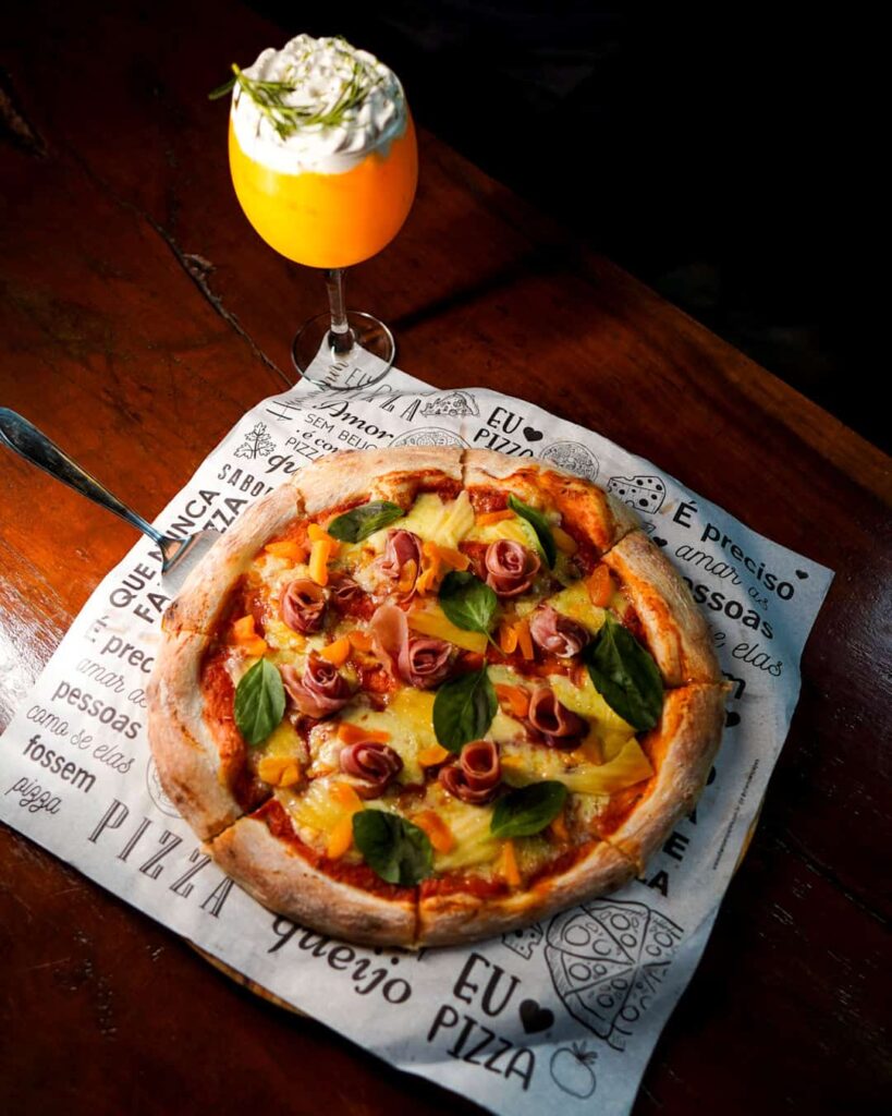 Prato: Pizza Parma – Massa de fermentação prolongada, molho pomodoro da casa, muzzarela, presunto de Parma, damasco, lascas de grana padano (rúcula ou manjericão)